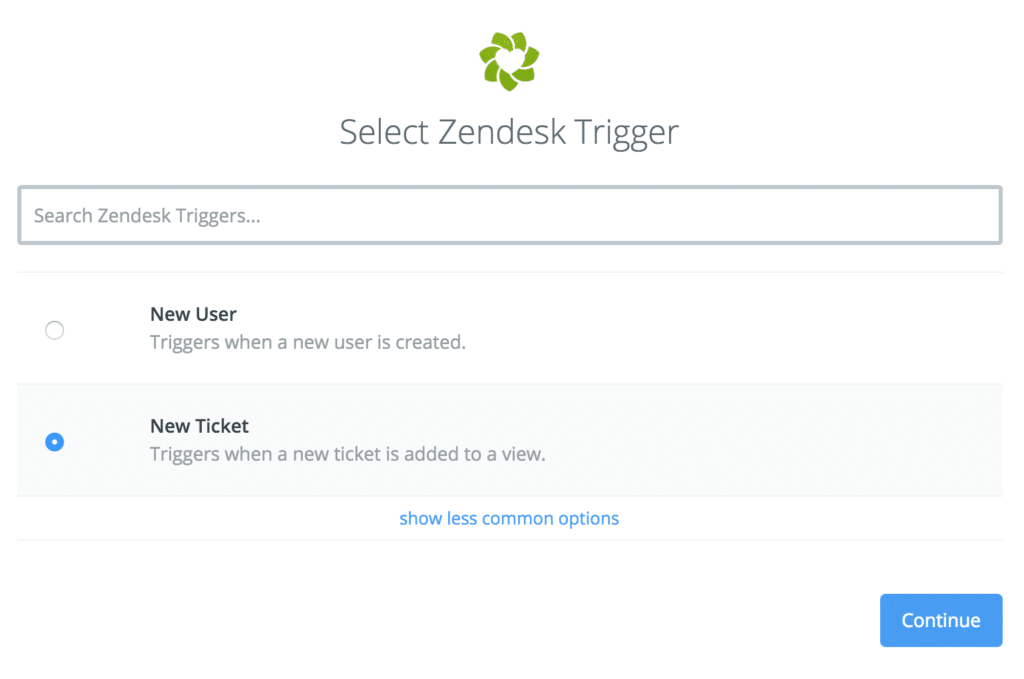 The first thing to do is to set up your trigger and authenticate your account. Our specific trigger is based on whenever a new ticket is created.