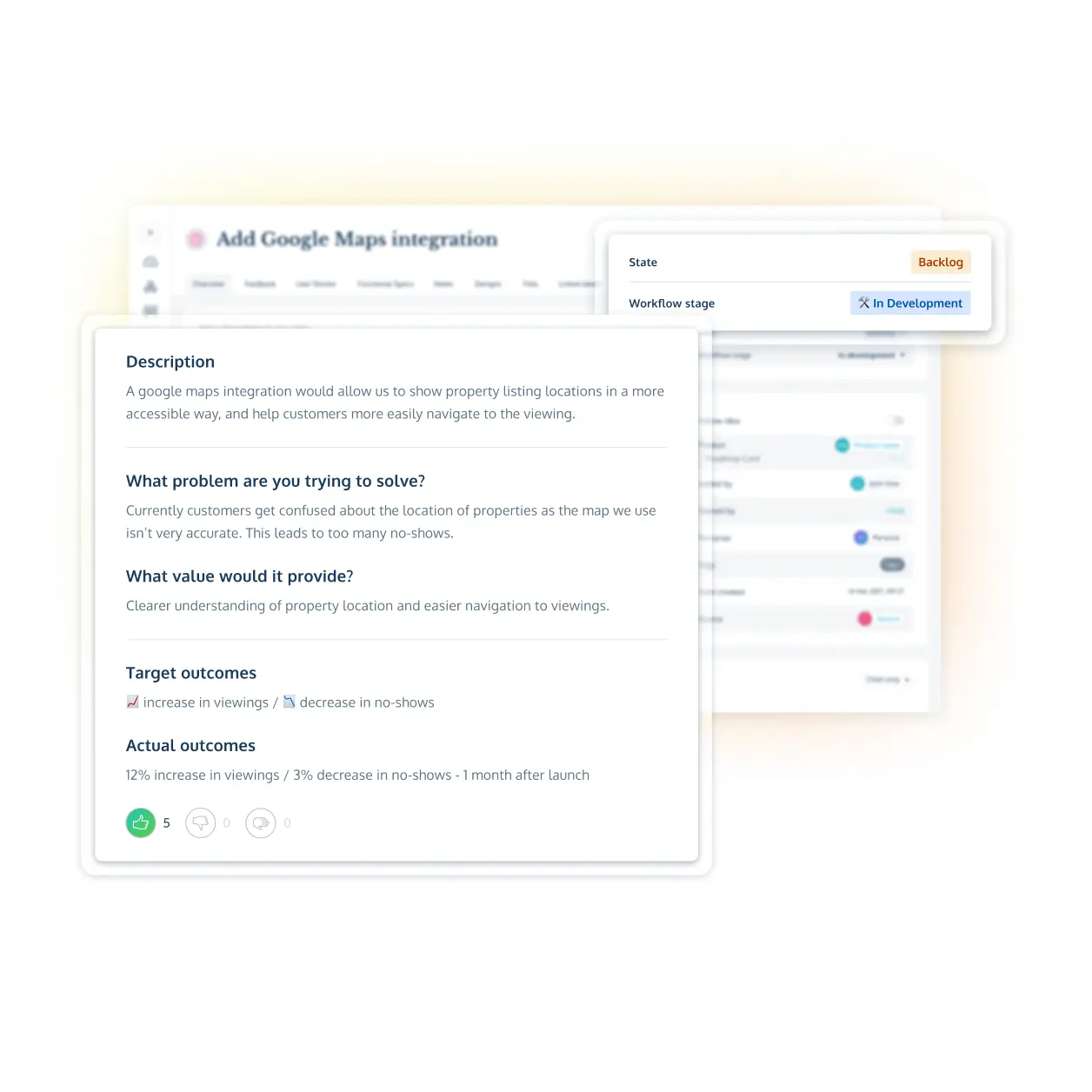 Validate your ideas with built-in questions and guidance to help you see if your idea has legs. Expand and enrich with a business case, customer feedback, user stories and designs, until you have a fully-formed product spec that’s ready to push to development and be brought to life.