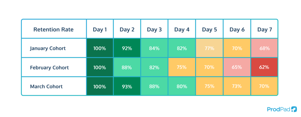 In this example, you’ll be able to see that the February cohort saw a much larger drop in retention on day 4 compared to the other cohorts in this table.