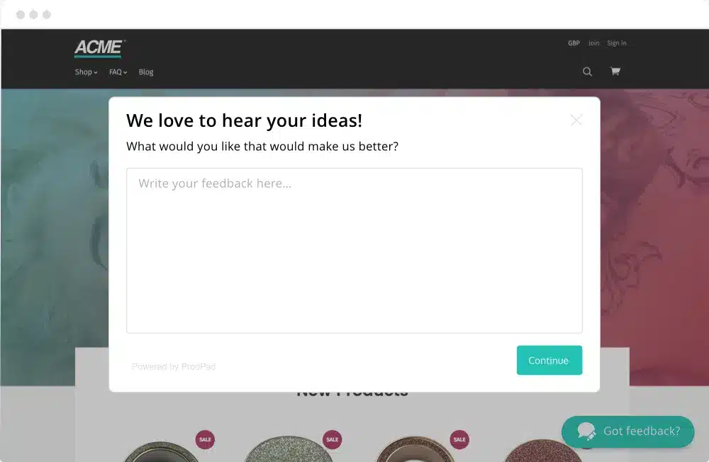 So many tools out there can help you do this, but we recommend you try using ProdPad to collect your customer feedback. Our in-app widget works hand in hand with our customer feedback portal (more on those below), and together they’re seamless and convenient.