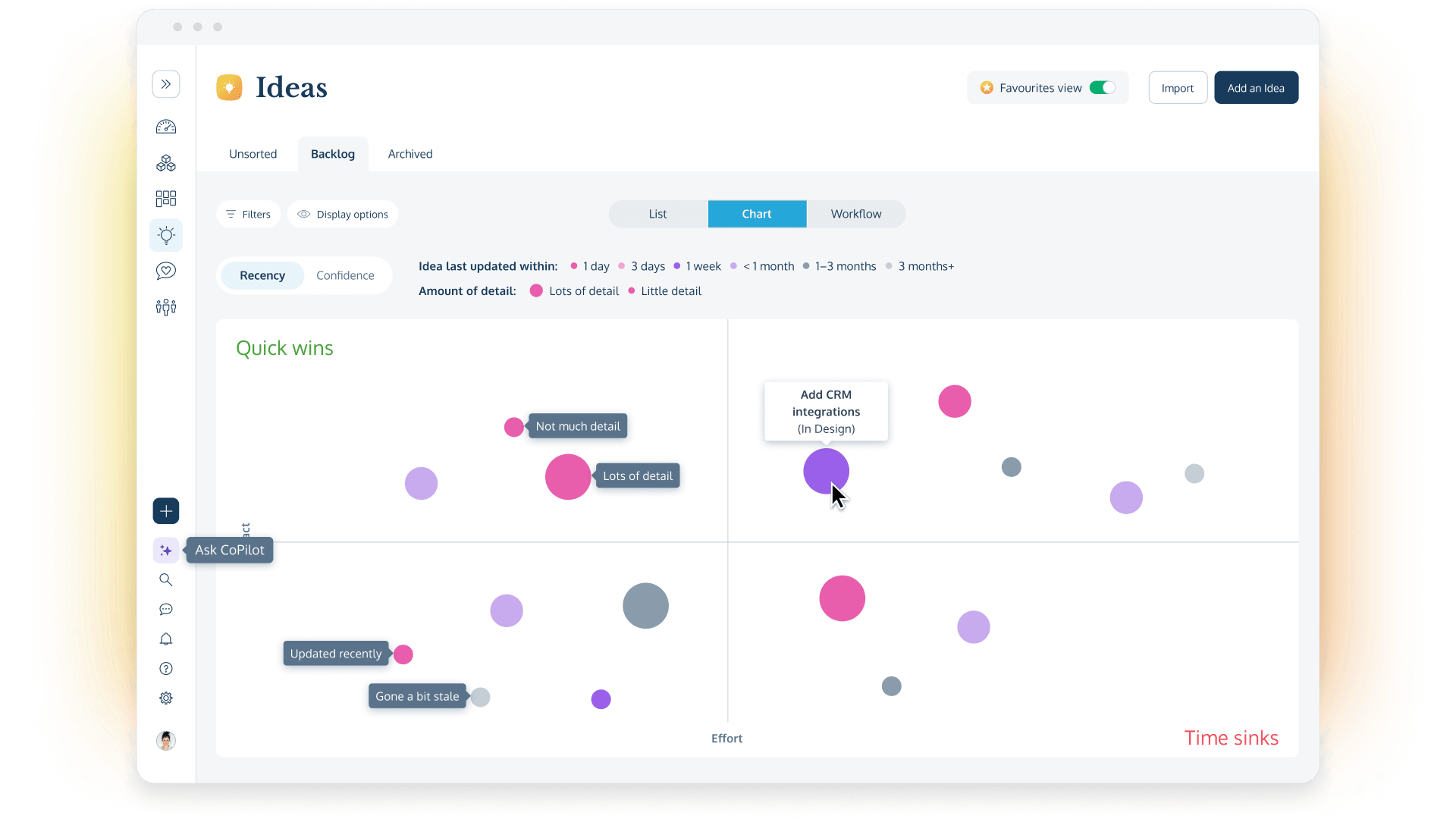 Easily see which ideas are wanted by customers and which are getting the most love from the team. Show the business value with impact and effort scores. Then take a step back and view your entire idea backlog in our unique priority chart, making it super simple to make smart decisions.