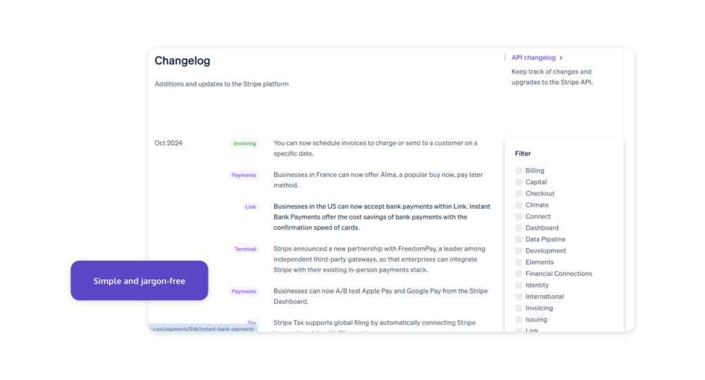 Stripe is a bit of a two-in-one, as instead of having one release notes example, they have a couple. Stripe has two different changelogs depending on the target audience, with one being designed to provide technical details, while the other created to be more universal and easy to understand for all.